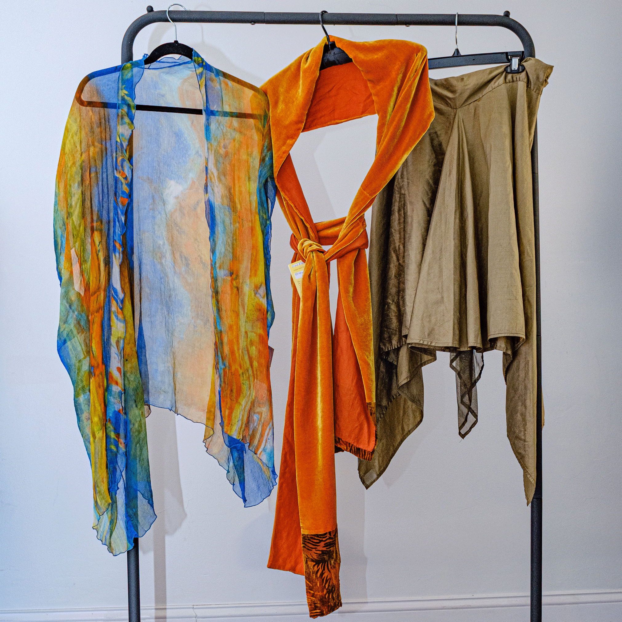 Crafted from hand-painted silk, this crinkle kimono (pictured on the left) showcases artisanal texture and fluid drape. Each piece features unique color variations from the natural dyeing process, creating a one-of-a-kind garment. The relaxed silhouette layers effortlessly over contemporary or traditional wear, while the lightweight silk ensures comfort across seasons. Perfect for those seeking distinctive, sustainably-minded pieces with timeless appeal.